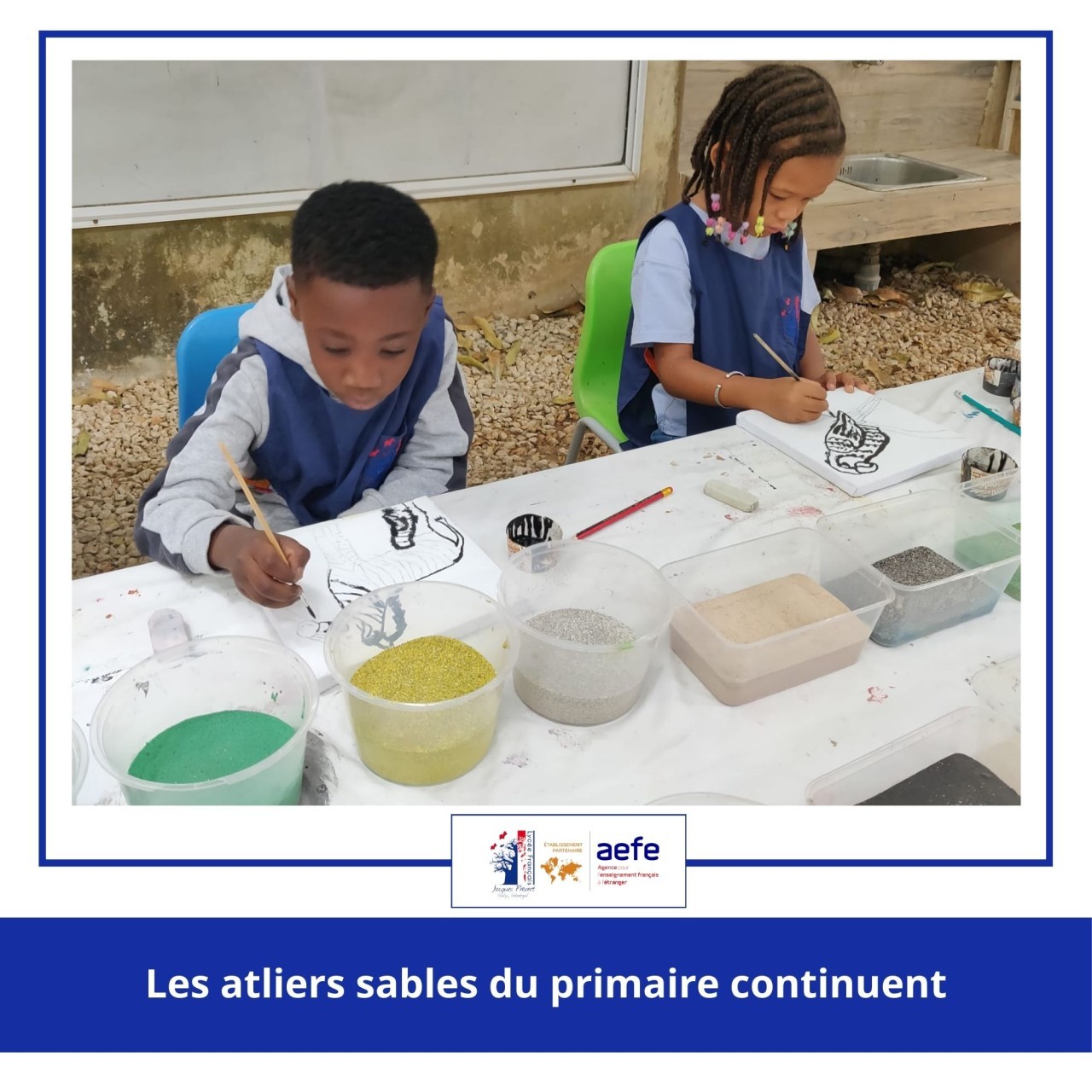 Les classes de la maternelle, CP, CP-CE2, CM1A et CM1B, ont vécu cette expérience sensorielle et artistique. Manipuler le sable, explorer les couleurs, travailler le geste et la précision : autant de découvertes qui sollicitent à la fois la créativité, la motricité fine et la concentration des plus jeunes.