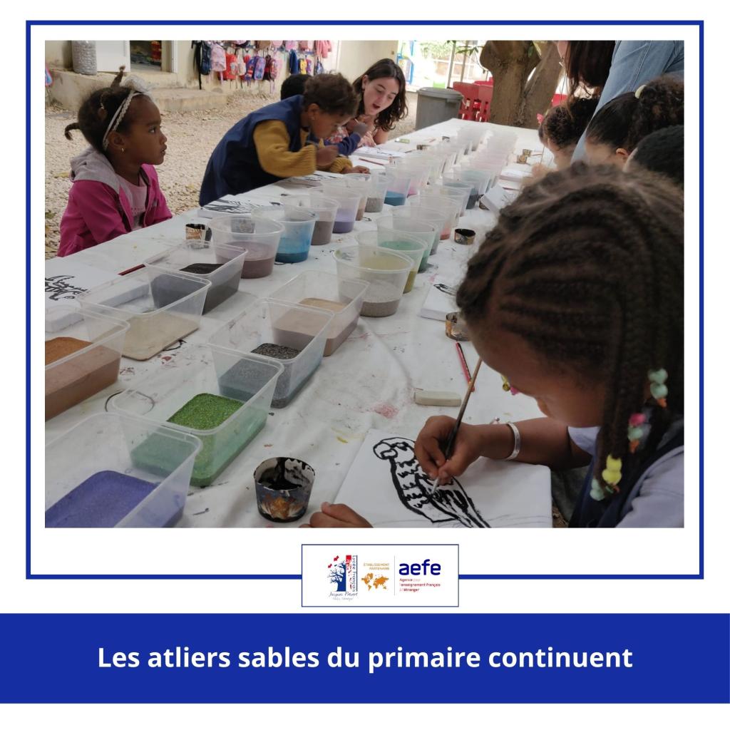 Les classes de la maternelle, CP, CP-CE2, CM1A et CM1B, ont vécu cette expérience sensorielle et artistique. Manipuler le sable, explorer les couleurs, travailler le geste et la précision : autant de découvertes qui sollicitent à la fois la créativité, la motricité fine et la concentration des plus jeunes.