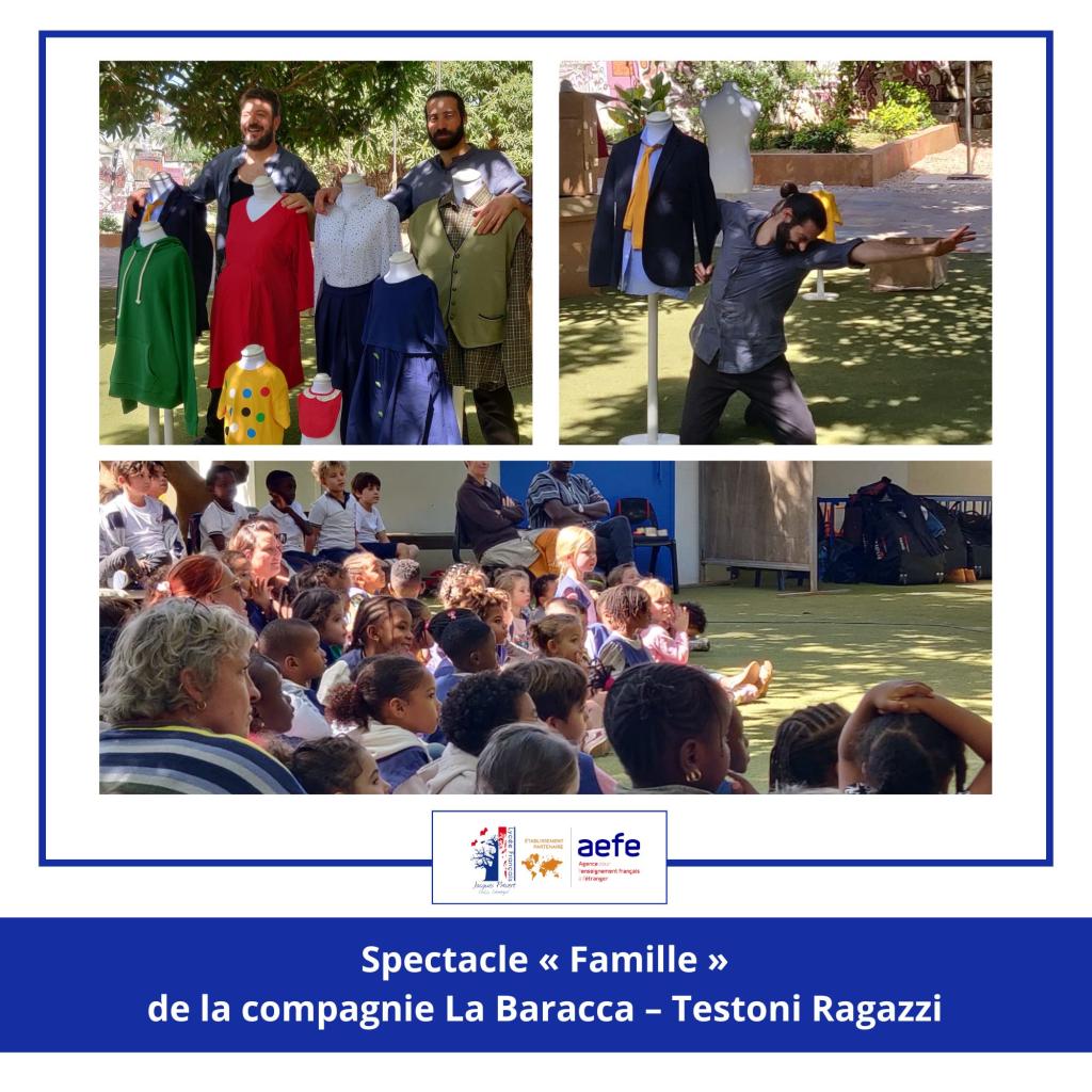 Nos petits élèves ont pu apprécier sous les manguiers, un spectacle haut en couleurs, où 2 personnages illustrent grâce à des mannequins, certaines scènes de famille, la parentalité, la place des grands parents et abordent avec tact les différents schémas familiaux actuels.